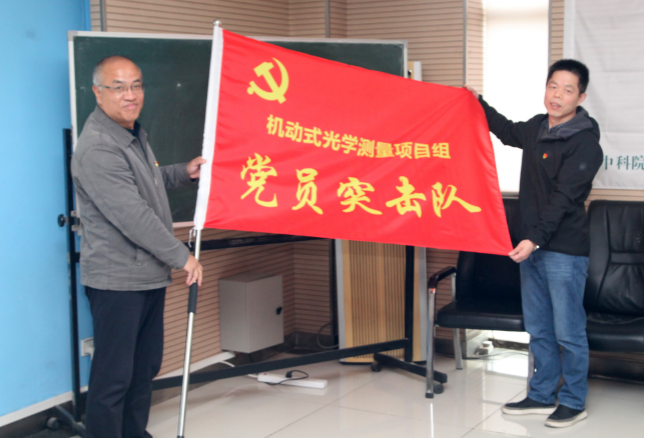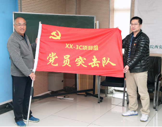 支部大會上謝梅林書記向廣大黨員宣貫主題活動實施規劃、口號和目標,向突擊隊員和先鋒隊隊員提出了明確職責要求。本次活動的口號:“攻堅克難力踐四個國家,凝心匯智盡展黨員風華”,時間從3月25日開始到項目交付結束,號召大家在科研實踐活動中對標中科院對全體科研工作者“四個國家”的定位和要求,讓黨旗在科研一線高高飄揚。為對本次活動進行廣泛宣傳和對參與隊員進行精神激勵,以及自覺接受廣大黨員群眾的督導,兩個項目的調試現場和研究室宣傳欄均進行了黨旗、隊旗和宣傳標語布置。